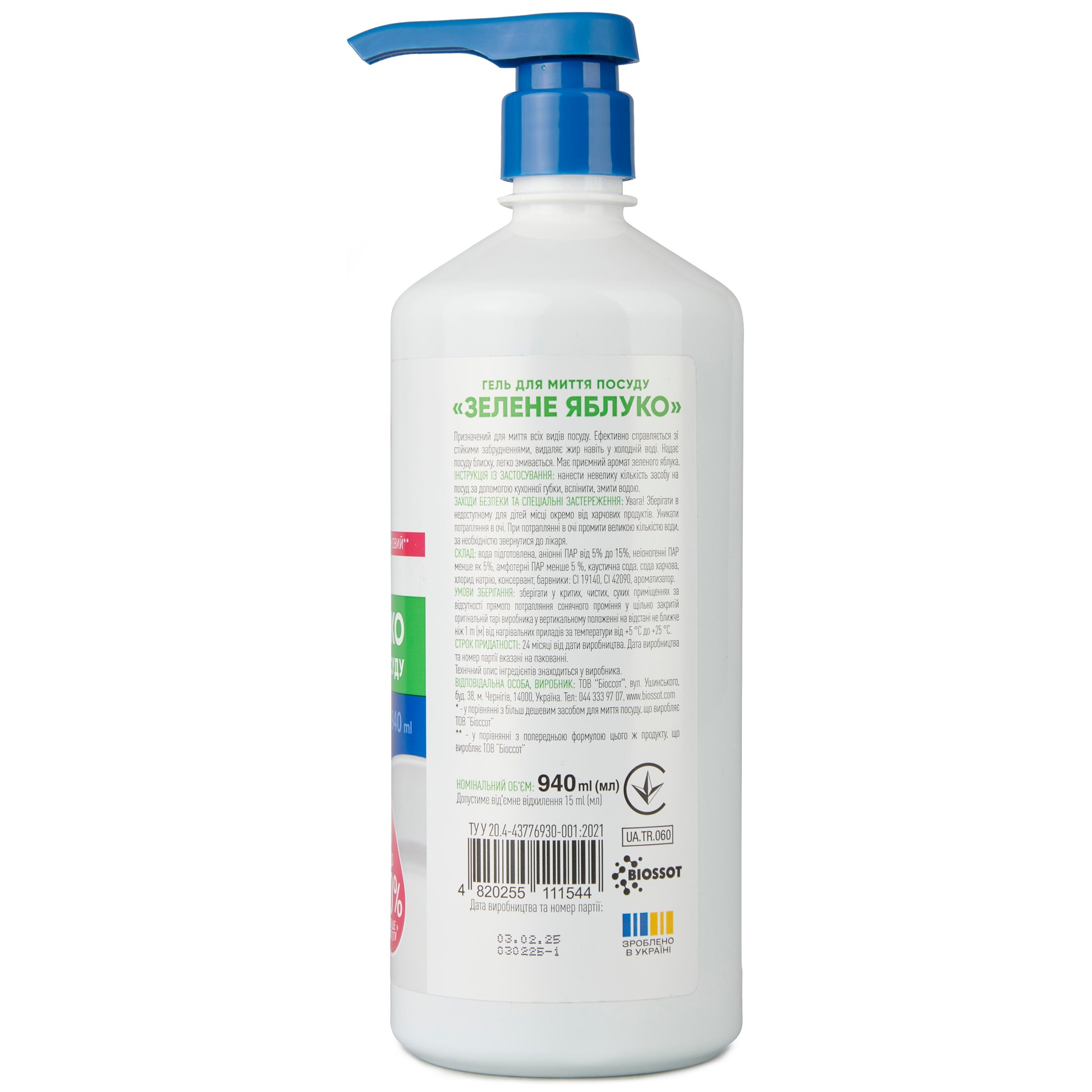 Склад продукту: Гель для миття посуду "Зелене яблуко" 940 мл.Формула розроблена на основі якісних і безпечних компонентів, що забезпечують ефективне очищення без шкоди для поверхонь і шкіри рук.