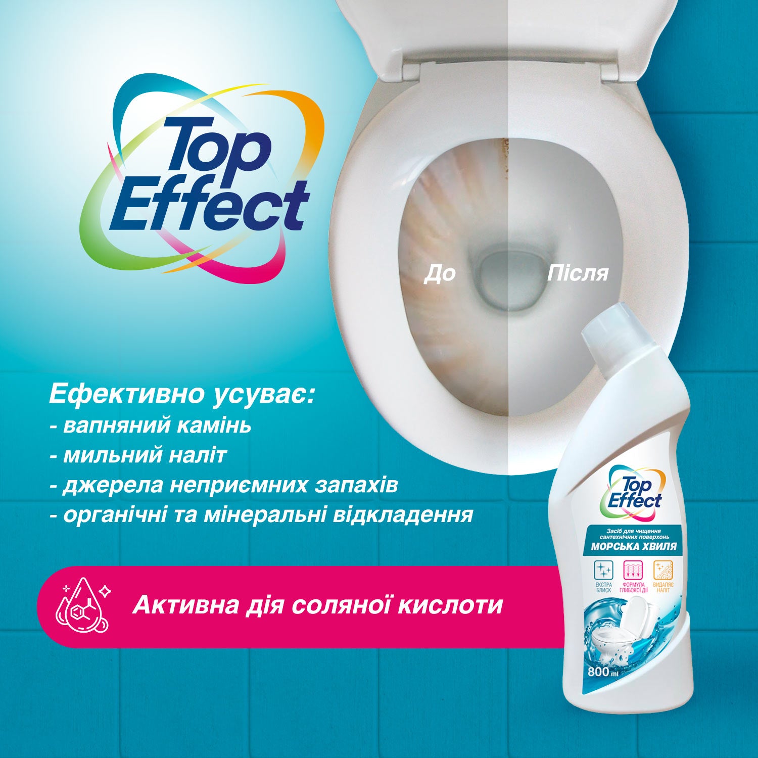 Засіб для чищення сантехнічних поверхонь "Морська хвиля" 800 мл від Top Effect створений для зручного щоденного використання. Просто дотримуйтесь інструкцій у розділі «Спосіб використання», щоб отримати найкращий результат — чистоту без зусиль і приємний аромат свіжості.