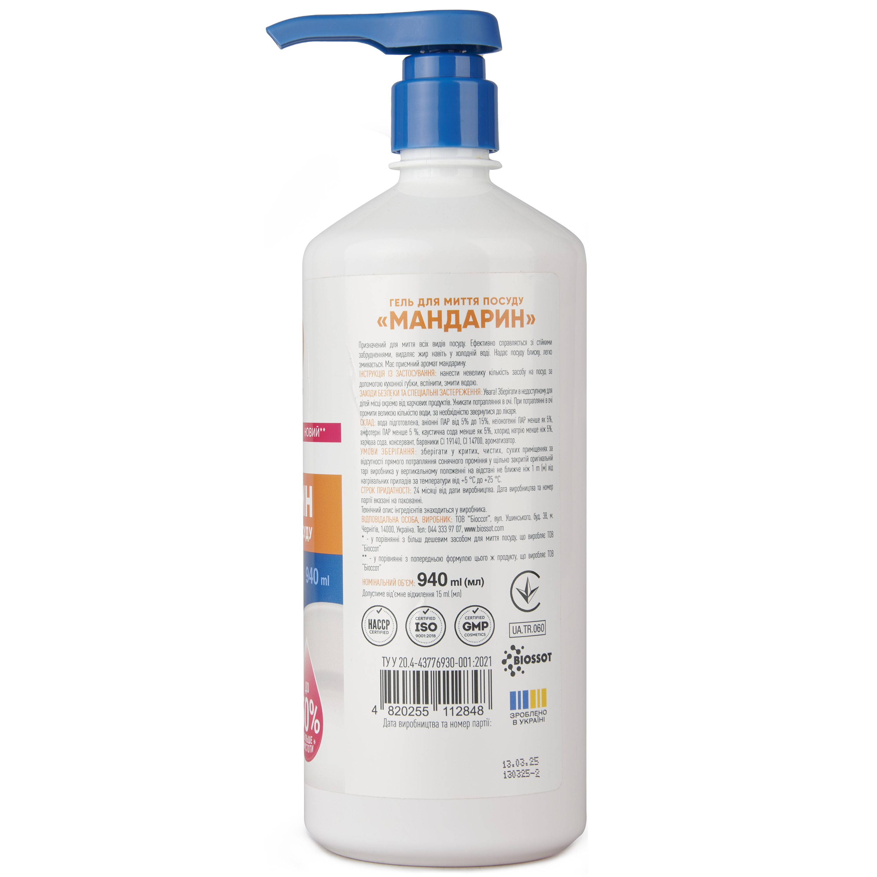Засіб для миття посуду з ароматом мандарину. Має гелеву консистенцію, легко наноситься на губку. Гарно піниться і розщеплює жир, усуває залишки їжі і неприємні запахи, легко змивається водою. Ефективний навіть у холодній воді. Підходить для миття скляного, пластикового, металевого, керамічного, дерев’яного посуду. Не пересушує шкіру рук під час використання засобу. Завдяки дозатору, використання продукту ще зручніше та економніше.